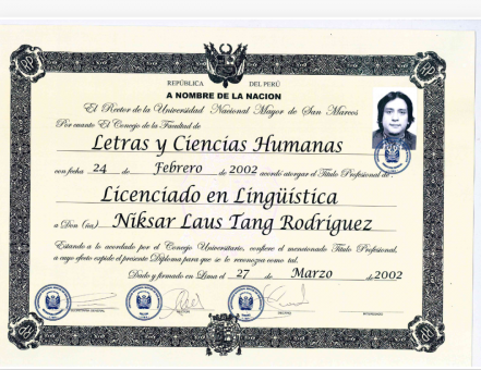 Национальный университет Сан-Маркос, Лима, Перу, факультет гуманитарных и социальных наук (год окончания - 2002).