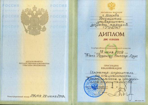 Российский университет дружбы народов (РУДН), специальность - инженер-строитель (год окончания - 2009).