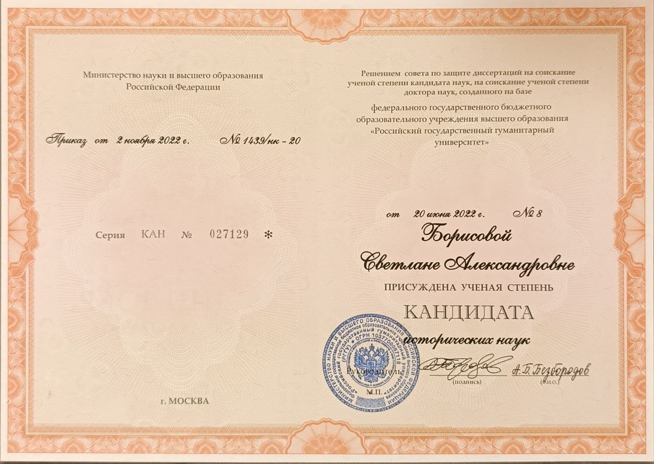 Образование: РГГУ (2022) - получение степени к.и.н., окончание аспирантуры.