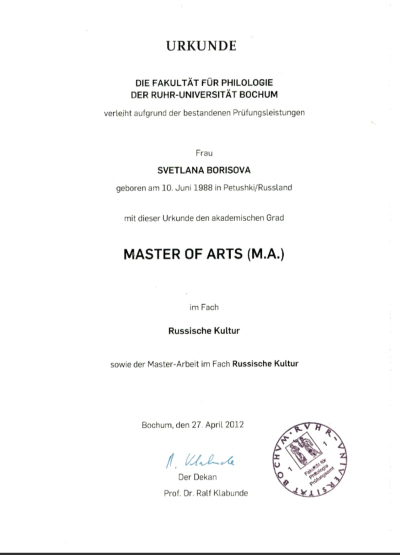РГГУ (2012) - магистратура Высшей школы европейских культур, специальность - культуролог; Рурский университет, г.Бохум, Германия (2012); факультет филологии, специальность - культуролог;