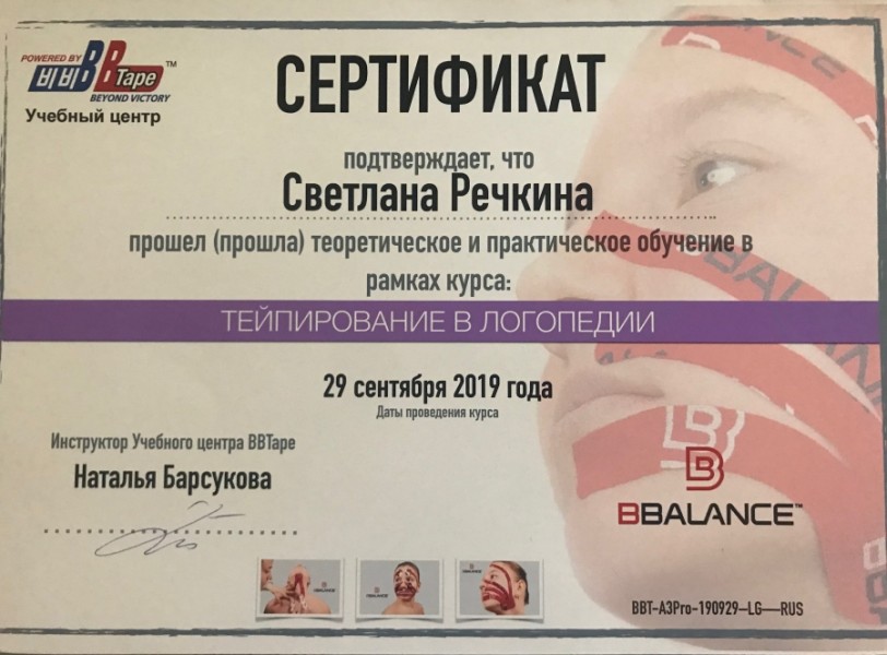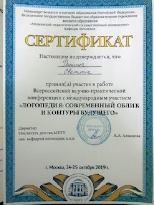 Образование: Институт дефектологии и медицинской психологии, курс «Дизартрия», 2019 г.