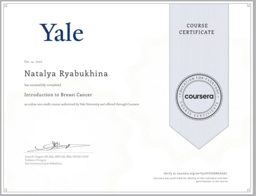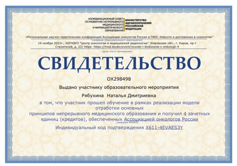 Образование: Имею высшее медицинское образование, а так же послевузовское образование (ординатура) по онкологии.