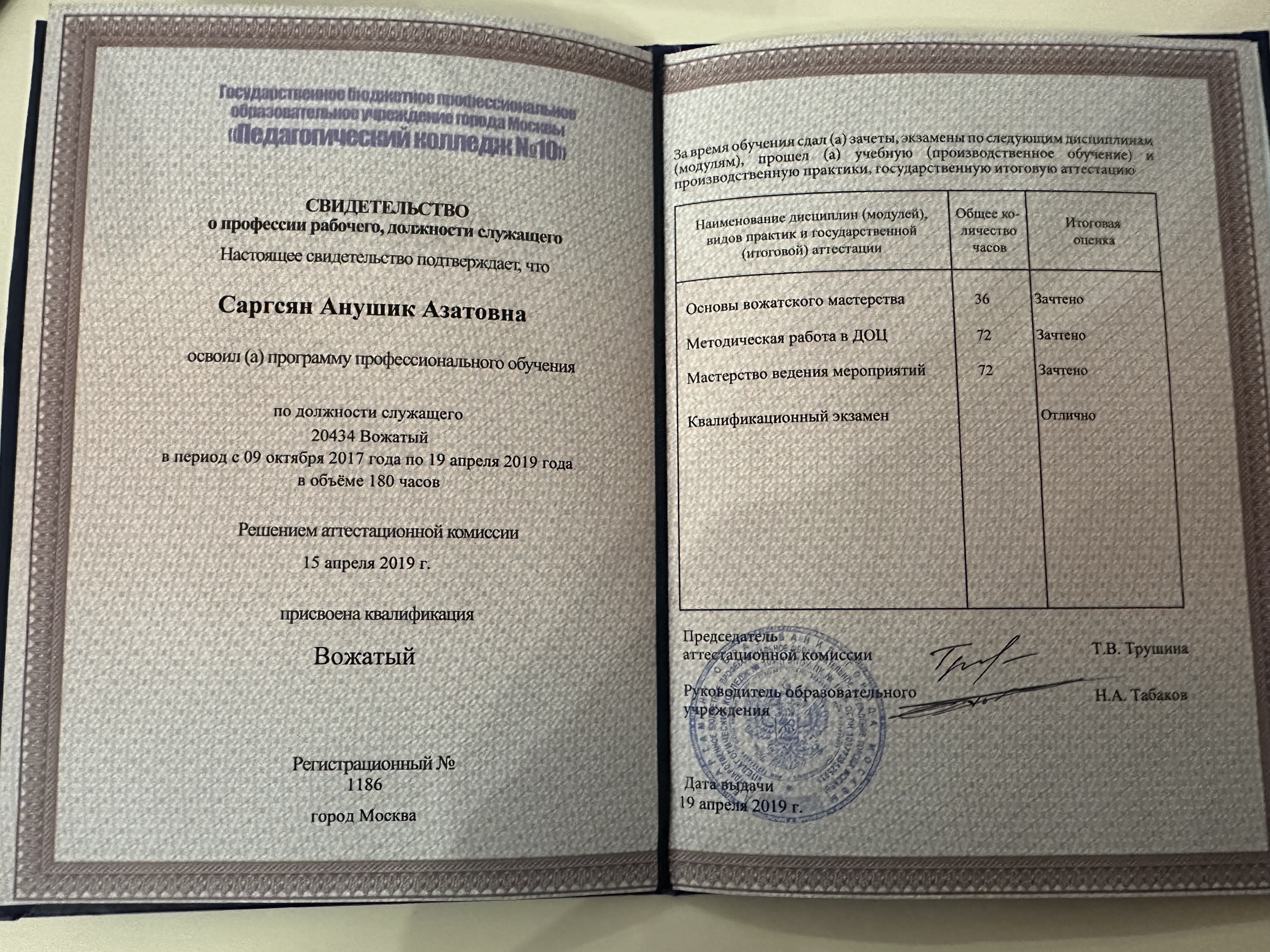 Учуcь в МГУ нa 5м куpce нa фaкультете «Высшaя школa перeводa». Также у меня есть свидетельство из «Педагогического колледжа №10» о профессиональной квалификации Вожатый, что свидетельствует о моей способности находить общий язык с детьми и подростками.