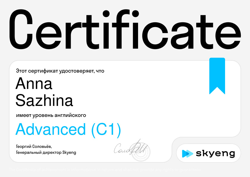 - Образование: Магистр, НИУ "ВШЭ", Иностранные языки и межкультурная коммуникация.