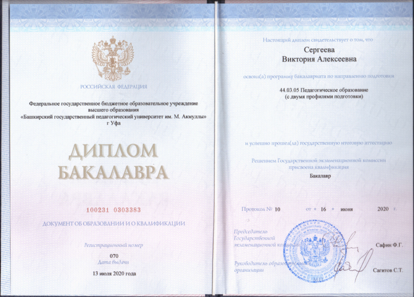 - Образование: Башкирский государственный педагогический университет, институт исторического, правового, социально-гуманитарного образования, бакалавр.