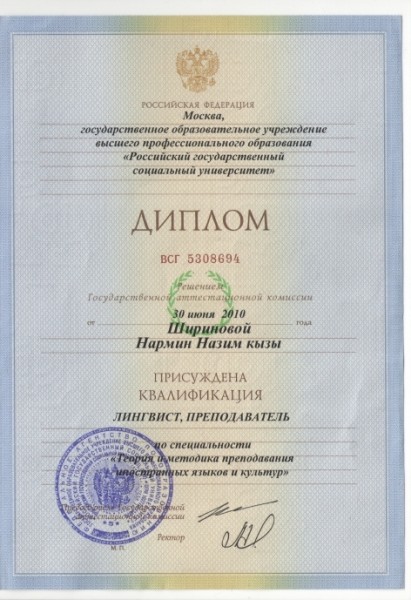 - Образование: Факультет иностранных языков(английский и французский) по специальности: теория и методика преподавания иностранных языков и культур.