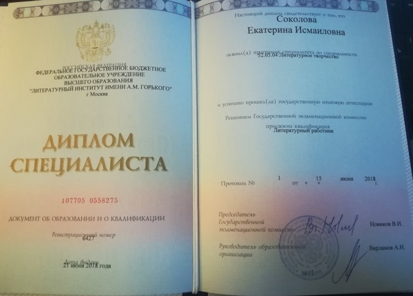 - Образование: Литературный институт имени А. М. Горького, факультет литературного мастерства, отделение поэзии, специальность - литературный работник. Выпускница 2018 года.