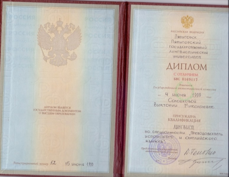 - Образование: ПГЛУ, факультет испанского и английского языков, 1999 г.