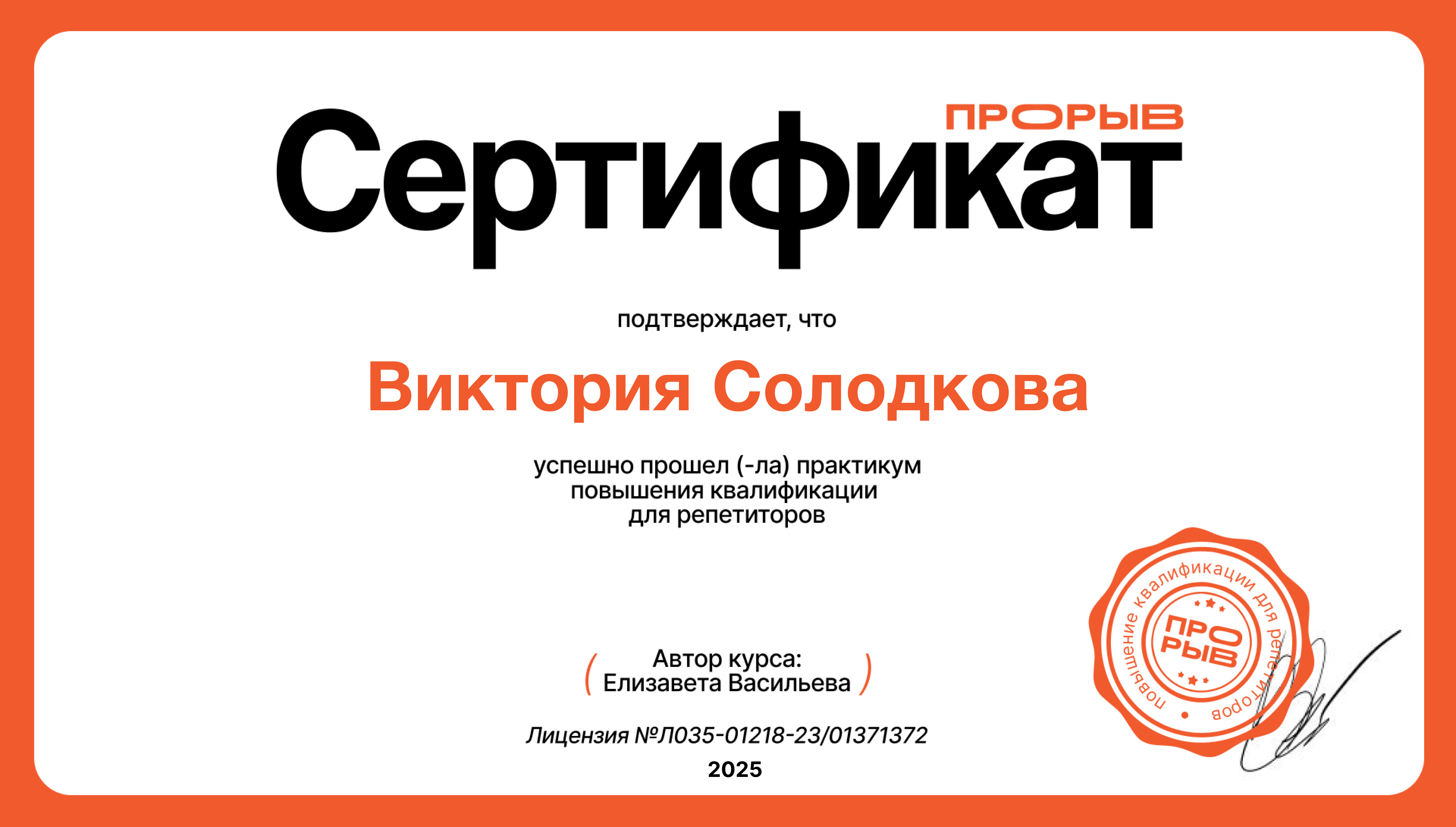 Мой подход доказал свою эффективность за более чем 20 лет преподавания. Максимальная погружённость (от элементарных до решения сложных заданий). Чёткий учебный план на весь срок обучения. Увлекательные уроки (динамичные, интересные, где преподаватель всегда в хорошем настроении и поддержит вас на пути к заветному результату! Очень много практики! Постоянный контроль (ни одно д/з не останется не проверенным, весь пройденный материал всегда повторяется). Поддержание мотивации (поддержание у учеников веры в себя, в собственные силы, а также доверия к преподавателю).