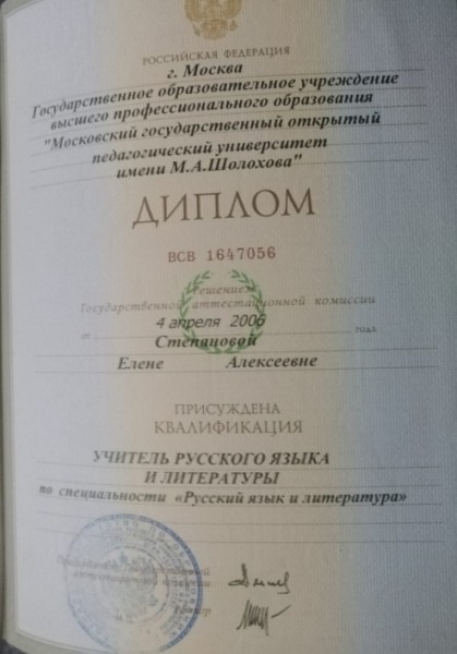 Московский Государственный Открытый Педагогический Университет имени М.А. Шолохова, 2006 г., учитель русского языка и литературы.