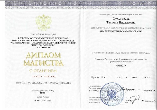 - Образование: Сыктывкарский Государственный Университет им. Питирима Сорокина. Факультет математики и информатики. Высшее педагогическое образование, магистр