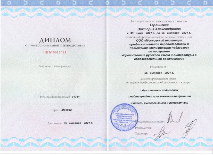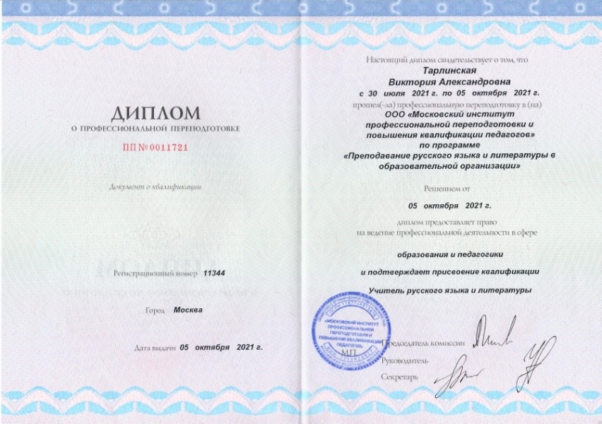 Московский институт профессиональной переподготовки и повышения квалификации педагогов, профессиональная переподготовка по программе «Преподавание русского языка и литературы в образовательной организации» — 2021
