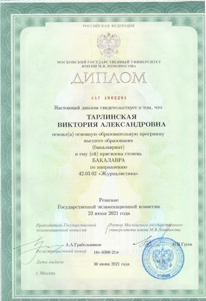 Образование: Московский государственный университет им. М.В. Ломоносова, факультет журналистики, бакалавр — 2021