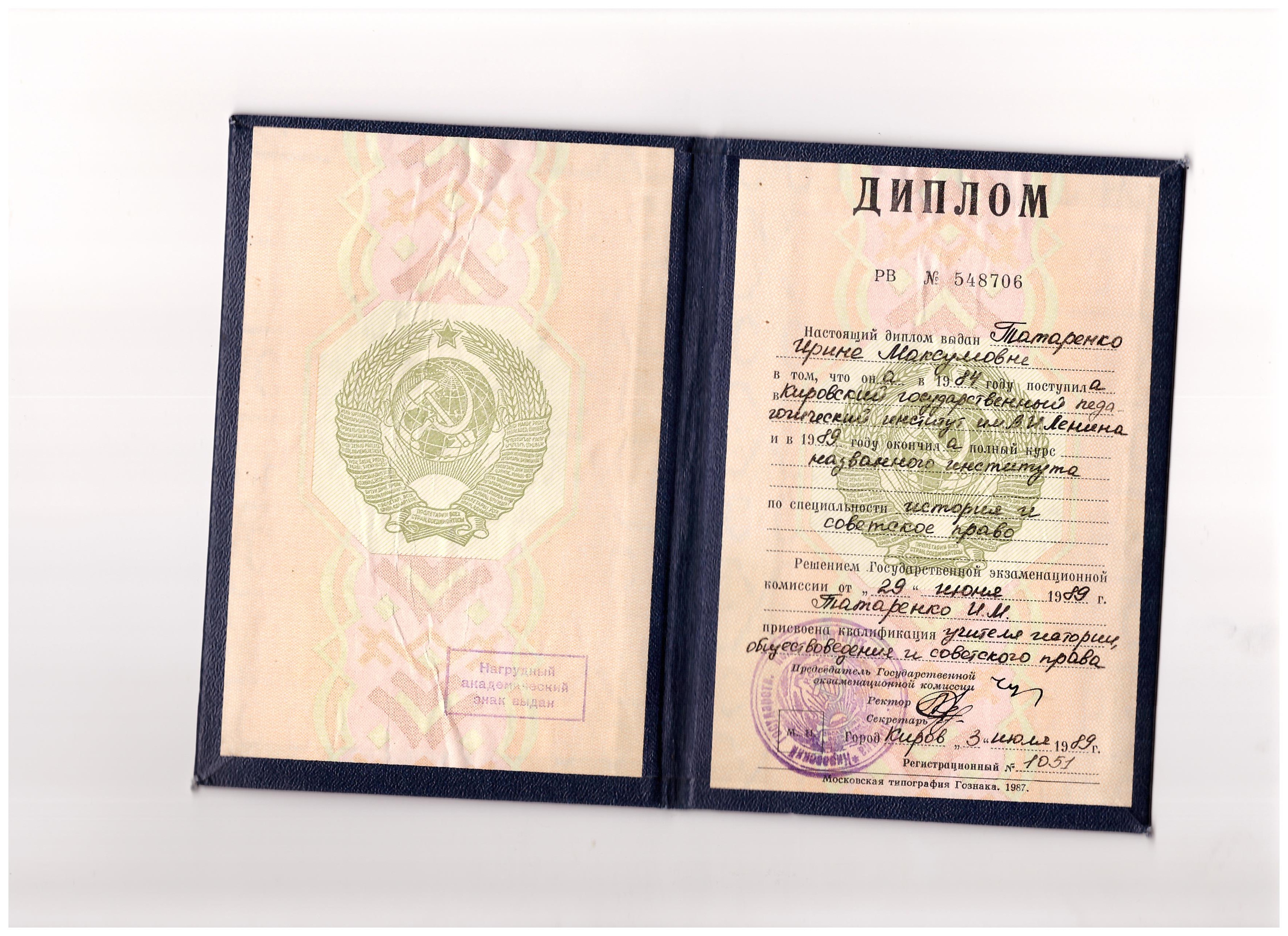 - Образование: Кировский Педагогический институт им. Ленина. Факультет история и советского права.