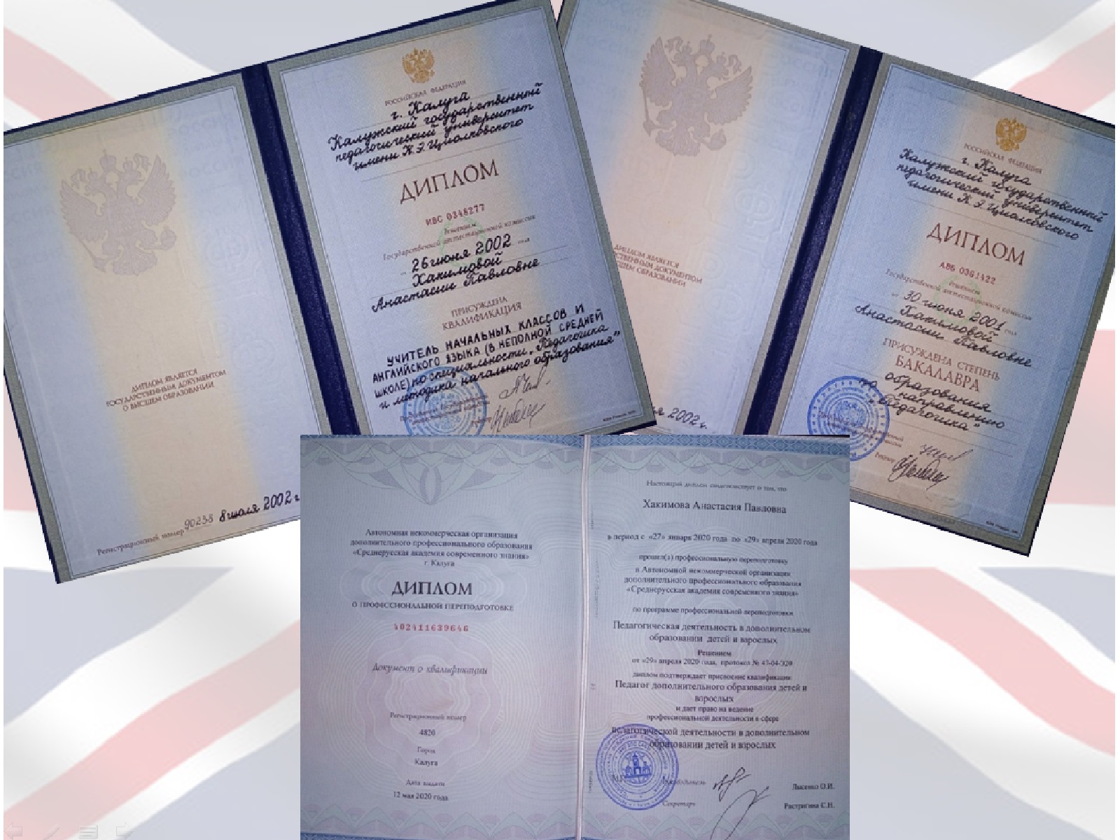 - Образование: КГУ им К. Э. Циолковского. Учитель начальных классов и английского языка