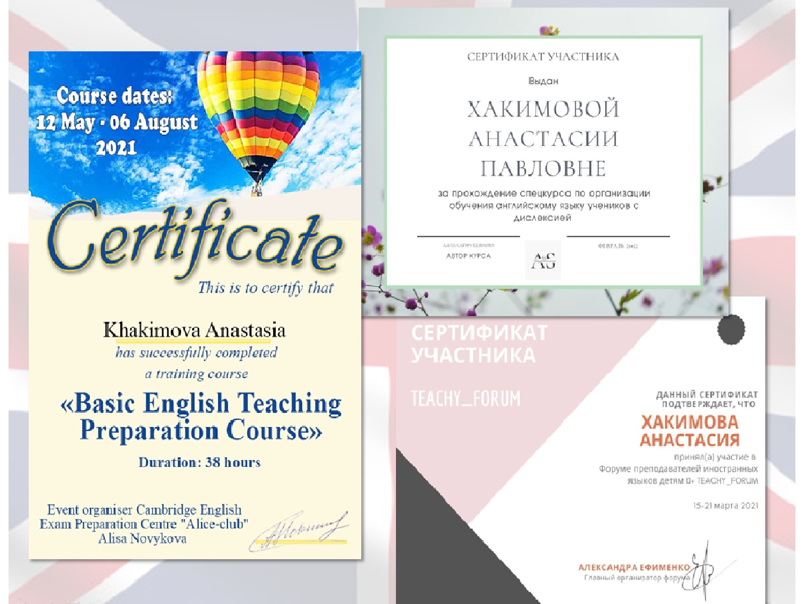 Дополнительная информация: постоянно слежу за новыми методиками и фишками в обучении, прохожу курсы и внедряю новое на занятиях