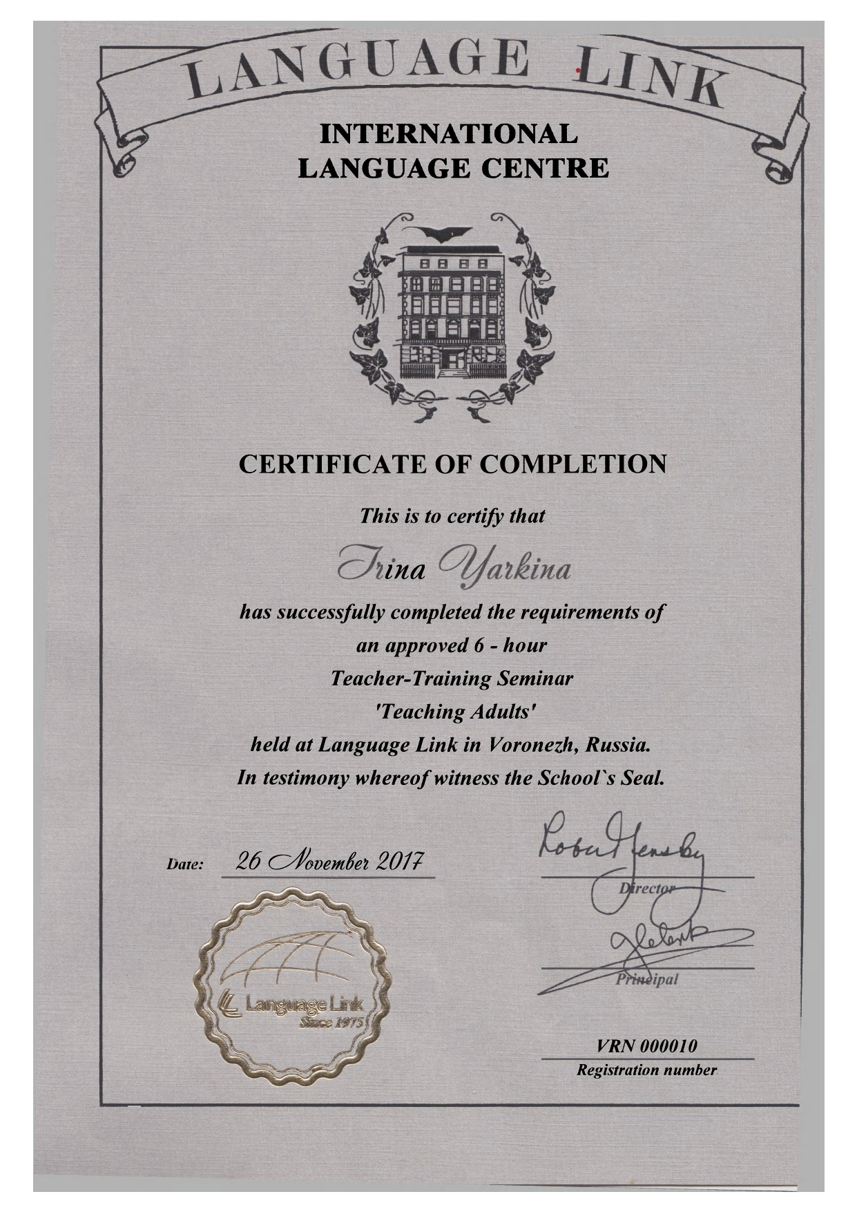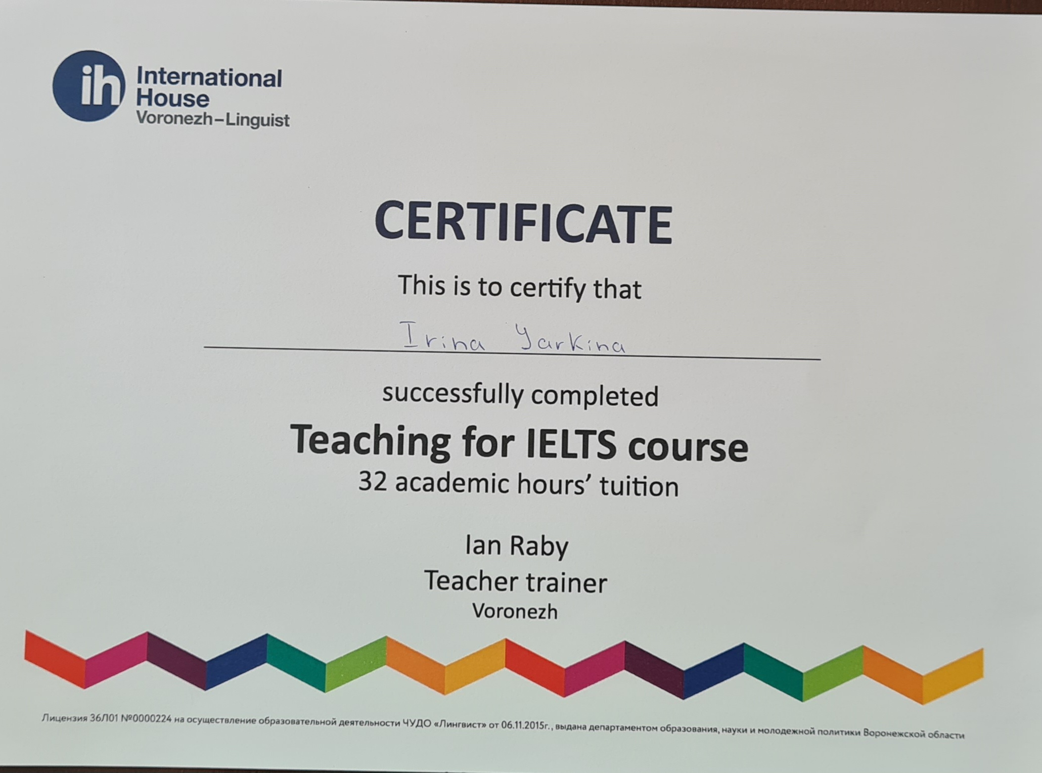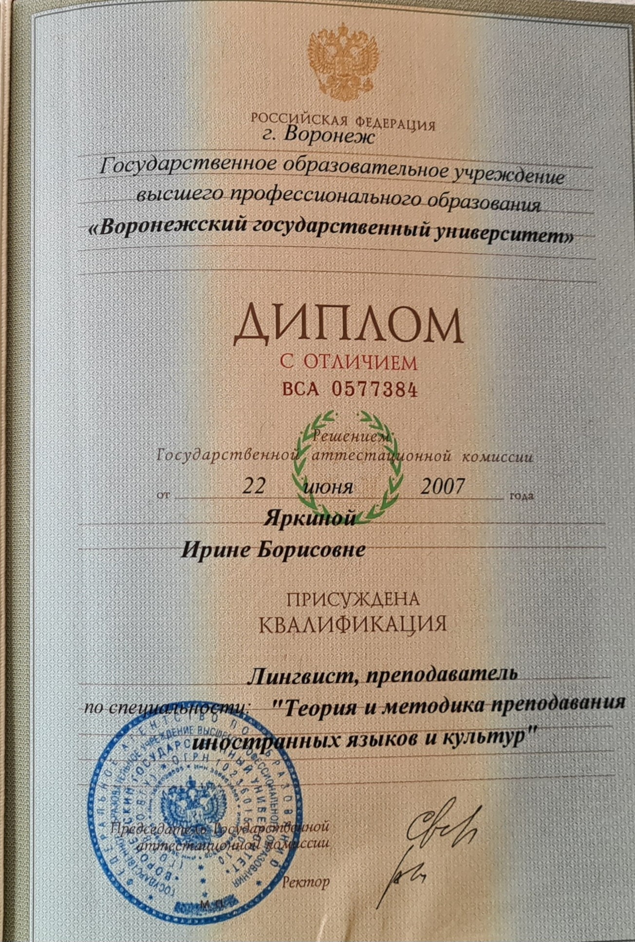 - Образование: ВГУ, РГФ (2007) диплом с отличием по специальности "Лингвист, преподаватель".