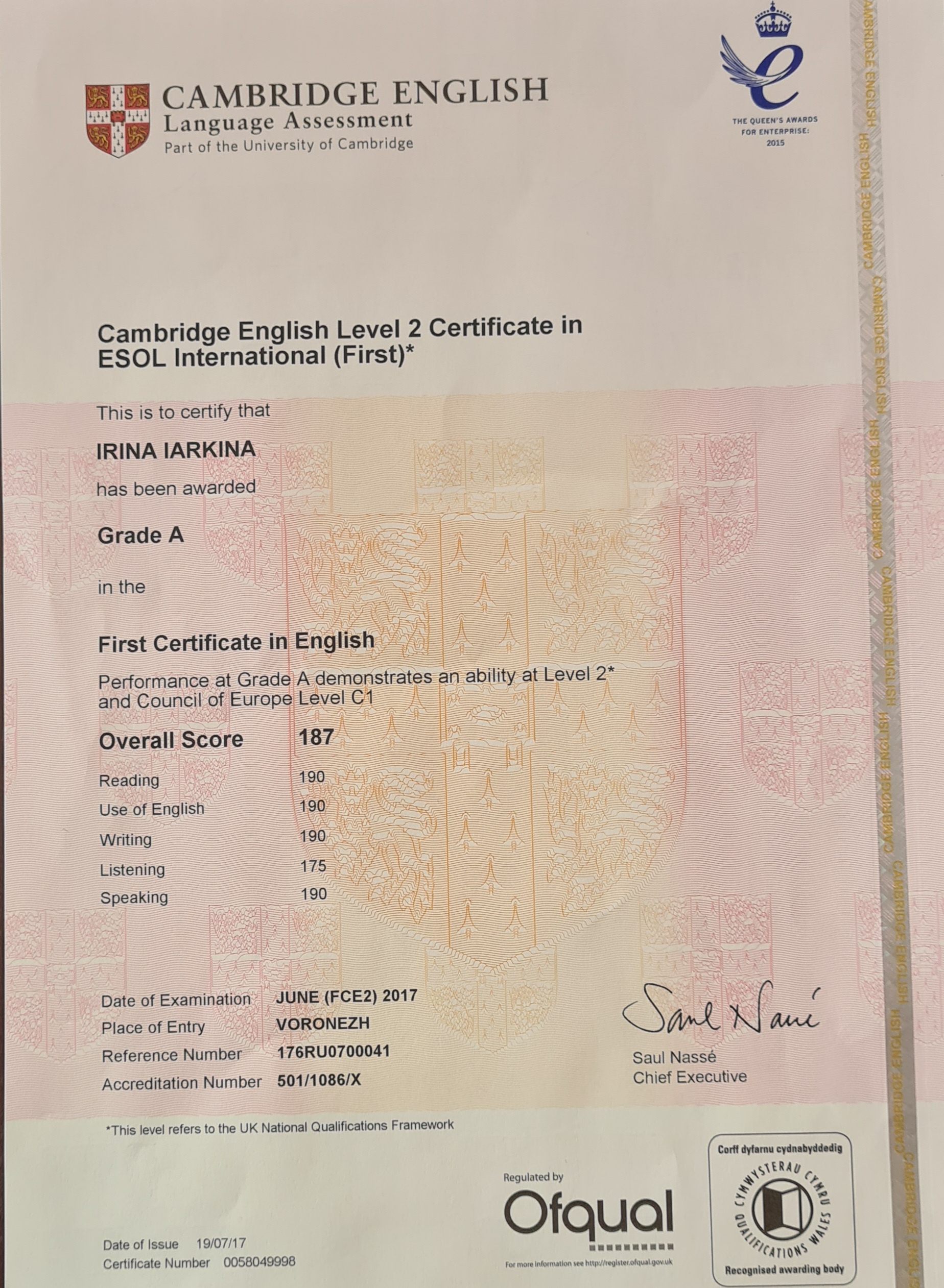 Подтвержденный международным сертификатом Cambridge уровень C1 владения языком.