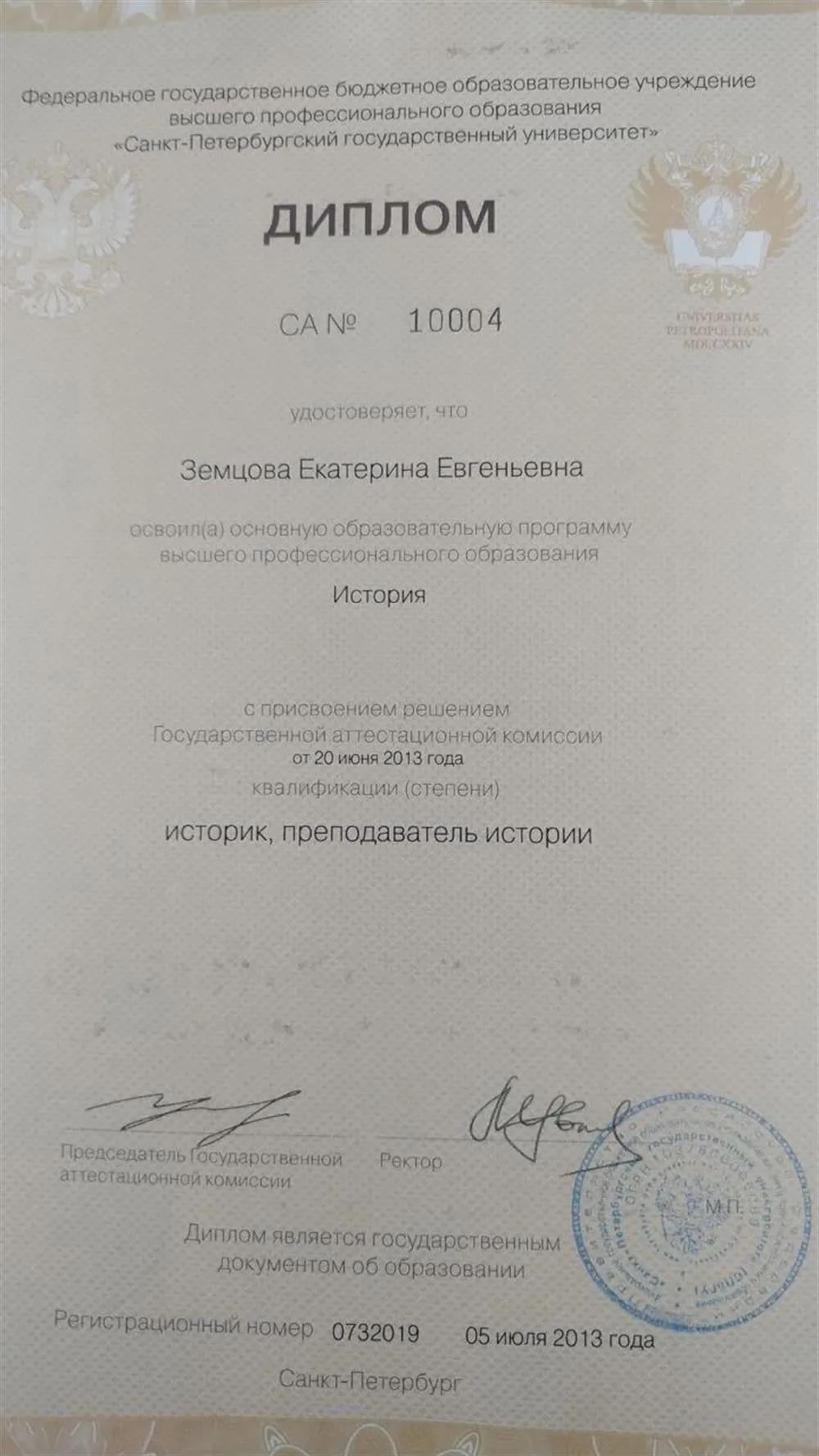 Образование: 1.Санкт-Петербургский Государственный Университет, исторический факультет, специальность: историк, преподаватель истории.