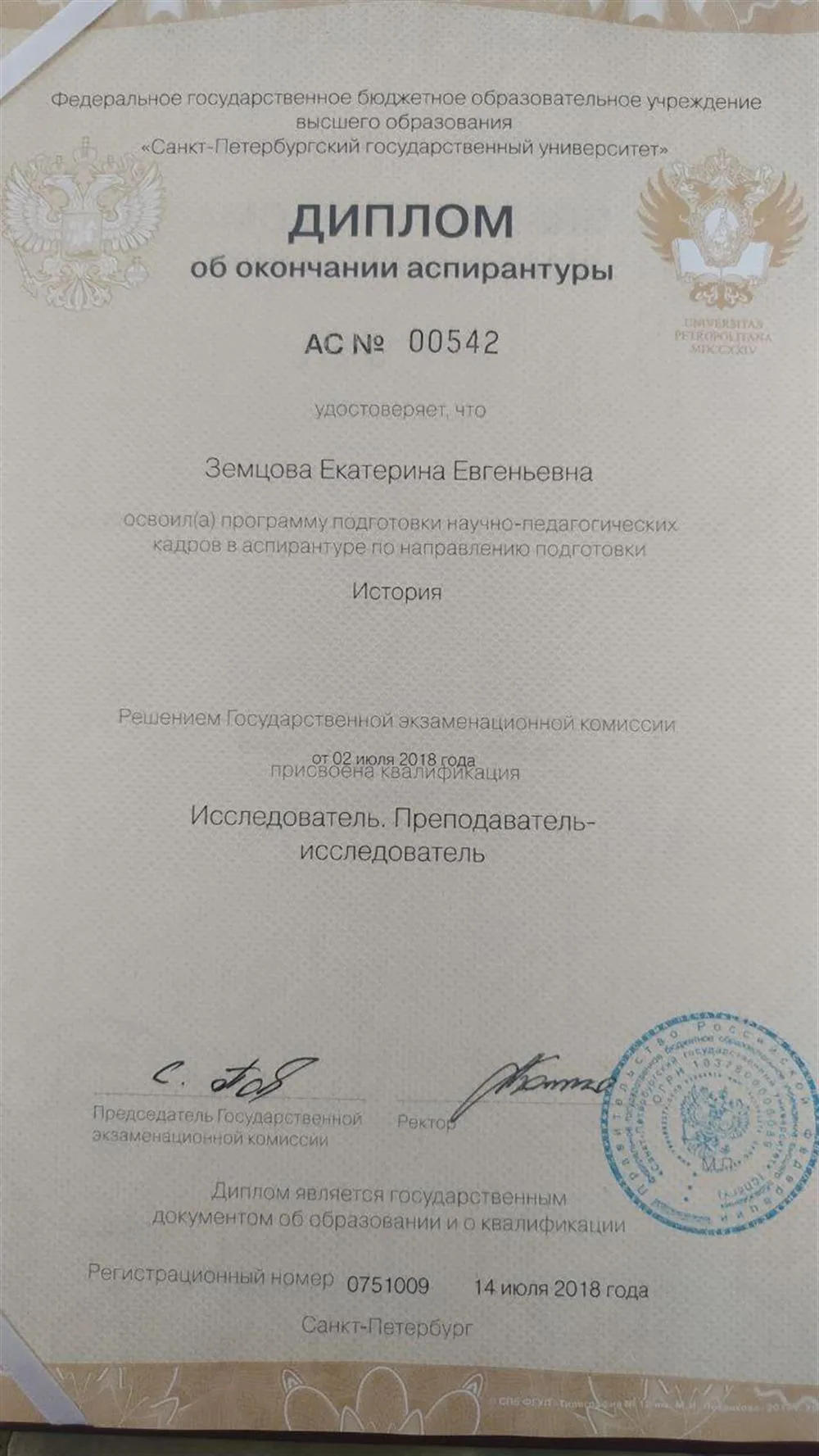 2. Институт Истории СПбГУ, аспирантура, 2018 год. Квалификация: исследователь, преподаватель-исследователь