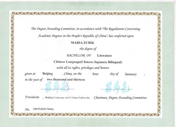 - Образование: Получила степень бакалавра в Пекинском Университете Языков и Культуры (Beijing Language and Culture University) по специальности литература Китая. Далее окончила Университет Tsinghua со степенью магистра по специальности инженера в сфере окружающей среды.